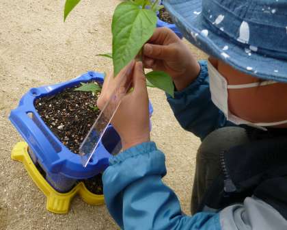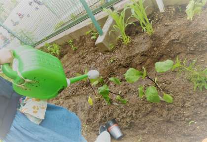自分の鉢植えには,ミニトマト,ピーマン,万願寺とうがらし,おくらの中から一種類選択して植えました。学年の畑には,ゴーヤー,キュウリ,ナス,サツマイモを苗で植えて,小松菜と枝豆の種まきをしました。苗を虫害から守るために,とうがらしもそばに植えました。「先生,ミントを植えても虫よけになるらしいって,お母さんが言ってたよ。」「実がなるのはいつごろかな。」「たくさんおいしい野菜が育つように,頑張ってお世話をしようね。」などと,みんなで話し合っていました。