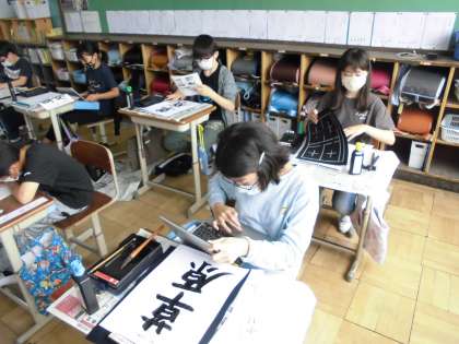 今年度初の習字の学習です。お手本の文字をしっかりと見て書いていました。