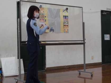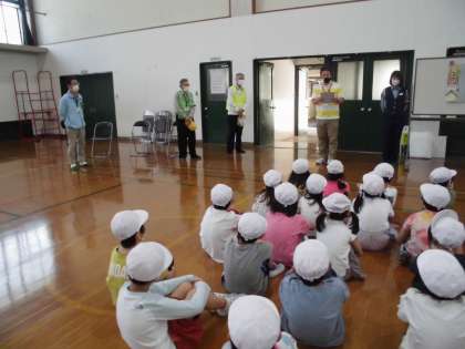 横断歩道の渡り方や路側帯の歩き方について確認しました。横断歩道を渡る時の5つの約束も知りました。その後実際に,1人ずつ横断歩道を渡る体験もしました。「これで完璧になった!」「手を挙げて合図を出した方が,安全だった!」と感想も話してくれました。