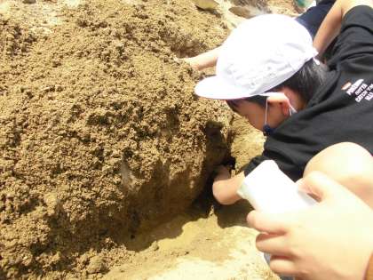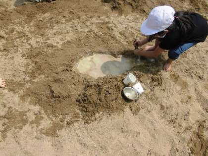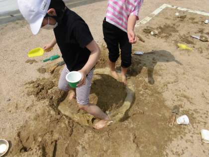 「泥水気持ちいい〜!これは足湯なんだよ!」「水を入れると,穴が掘りやすくなるんだ!」いろんなことを発見しています^^