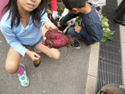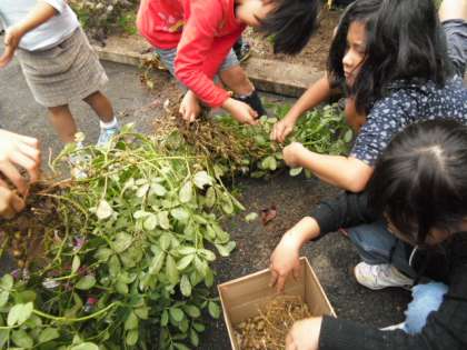 収穫は,サツマイモと落花生。サツマイモは一つのプランターや袋から5〜6個とれました。落花生は一つの株から20個以上。どちらも土の中から現れたときは,「ウォー」と歓声があがりました。やっぱり実ができるというのは,うれしいものです。
