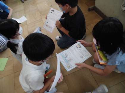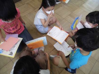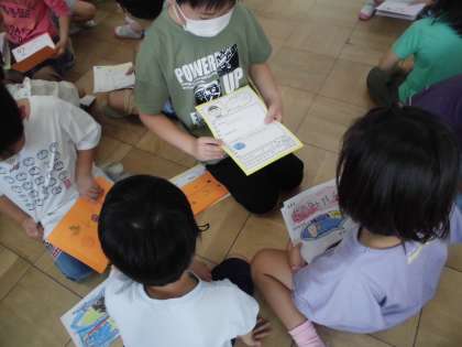2年生の自己紹介カードには,似顔絵や好きなこと1年生にメッセージを書いてくれていました。1年生のカードには,名前と好きなものを絵や字で書きました。とっても大切に持ち帰っていましたね♪