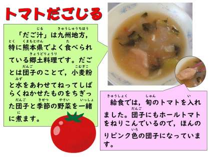 「だご汁」の「だご」は団子の意味で,だご汁は小麦粉と水をねって作った団子の入った,九州地方の郷土料理です。今日の給食では,旬のトマトを使ってトマトだご汁にしました。けずりぶしでとっただし汁・料理酒・みりんで鶏肉・たまねぎを煮て,小麦粉・片くり粉・塩・水・果肉を細かくつぶしたホールトマトを合わせてよくねってしばらくねかせたものをスプーンで少しずつすくって団子を作って入れました。さらにトマトと小松菜を入れています。味付けは塩・しょうゆでしました。トマトのうまみや酸味が暑い日にさっぱりと味わえる汁ものです。子どもたちは,トマトをねりこんだほんのりピンク色のもちもちの団子と一緒に,喜んで食べていました。