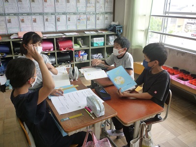 自分の考えを書いたノートをぐるぐると回して,友達の考えを知ったり,ひとりひとりが考えを発表したりと,班ごとに交流している様子です。