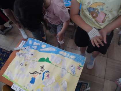 今日は図工科「やぶいたかたちからうまれたよ」の作品が完成し,鑑賞を行いました。