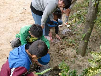 後半の実習では,運動場の南端に植えてある樹木の根元に穴を開けてもらい,根を観察した後,腐葉土と地中で空気や水を通りやすくする石を入れて,根を育ちやすくしました。