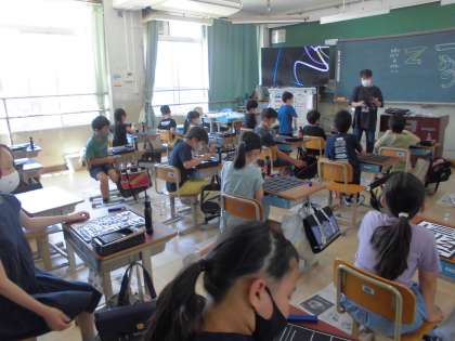書写の時間に初めて毛筆の学習をしました。今日は用具の名前を覚え,準備の仕方や後片付けの仕方を中心に学習しました。毛筆の感触を確かめながら,半紙に様々な線を書いてみました。