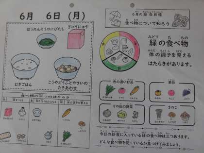 とてもきれいに色を塗ってくれていたので,ホームページで紹介したいと思います。6月6日(月)給食があれば,「麦ごはん,高野豆腐と野菜の炊き合せ,ほうれんそうの煮びたし,牛乳」でした。給食がなかった分は,持ち帰り給食として,みかん缶を持って帰ってもらいました。