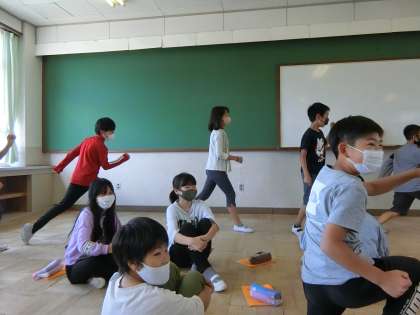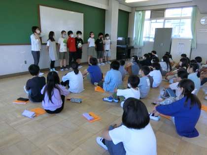 山の家での宿泊学習に向けて,学年で集まってキャンプファイヤーの練習をしました。レク係が中心となって進め,とても盛り上がっていました。