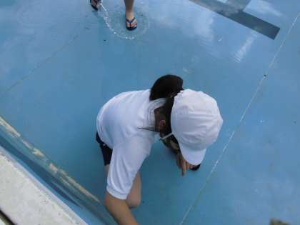 プールの底や壁面の掃除を楽しそうに進めながら,一生懸命に取り組んでくれたのでみるみるうちに汚れが落ちていきました。