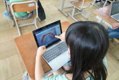「パソコンで絵を描くと,間違ったときに簡単に元に戻せたり,色を変えたり自由にできるところが便利だな。」「もっといろいろな筆やペンで描いてみよう。」など,GIGA端末をつかう良さに気づいていたようです。