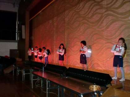 3くみの劇を楽しんだ後、1年生の「楽しい秋の音楽会」が始まりました。練習の時には、舞台での並び順や楽器の持ち替えを覚えるのに何回も繰り返し、立ち稽古をしました。夢中になって歌って踊ると、ピアノの伴奏の音が聞こえなくて合わなくなってしまい、困ったりもしました。合奏でも、みんなの音と合わせるために何度も繰り返しました。今日は、今までで一番きれいに合わせることができました。1年生全員たいへんよく頑張りました。