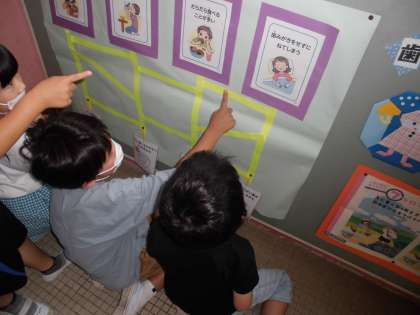 掲示板の上の絵は,歯にとってよくない生活です。「ぼく,こんなことあるわ。」と言いながら,楽しそうに線をたどっていっていました。すると,こんな影響があるのかと読んでいました。カードをひっくり返すと,そのわけを書いています。楽しそうに読んでいる後ろ姿がとてもほほえましいです。
