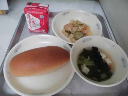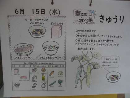 6月15日(水)の献立は,「黒糖コッペパン,牛乳,ソーセージと野菜のいためナムル,とうふと青菜のスープ」でした。ソーセージと野菜のいためナムルには,キュウリが入っていました。キュウリはウリ科の野菜で,水分が多く,体温を下げる働きがあります。体の調子を整える緑の食べ物です。サラダやスープ,炒め物などいろいろな料理に合う夏においしい食べものです。