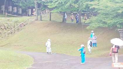 小雨の中、フライングディスクゴルフに挑戦しています。うまく投げられるかな。
