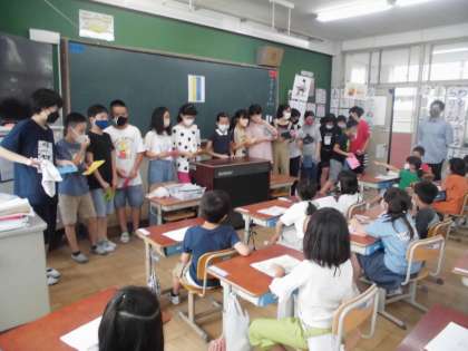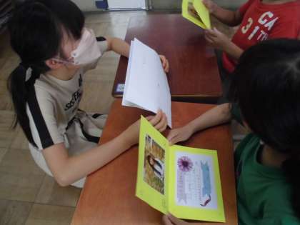 今日は初めての顔合わせだったので,自己紹介を行いました。1年生は名前と好きなものを書いた自己紹介カードを作り,紹介を行いました。6年生からもらったカードには,顔がわかる写真と,素敵なメッセージが書いてありました。紹介カードを手元に話に花を咲かせてとても盛り上がっていました。