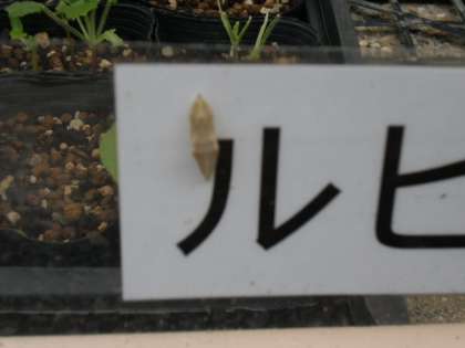 職員室の南側で育てている大根の葉っぱにモンシロチョウがたくさん卵を産みつけていたようです。アオムシに食べられて,さんざんなことになってしまいました。憎いアオムシなのですが・・・今日さなぎになっているのを見つけました。「無事冬を越して,蝶になってね。」と願わずにはいられないのが不思議です。
