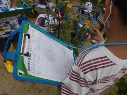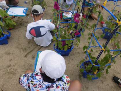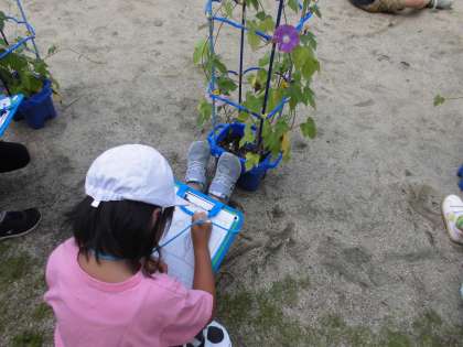 日陰に入り,初めての探検ボードを持っての観察です。とってもワクワクしていました。「わたしのアサガオはつぼみが13こある!」「紫色だけではなくて,水色の花が咲かないかな?」「絵に描くのが難しいな…」と,学習に一生懸命取り組んでいました。