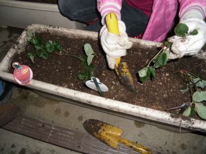 今日の活動は,イチゴの苗の植え替えです。今年の春に実ができたあと出てきた新しい苗です。プランターの土に肥料と腐葉土と油粕を混ぜるのはいつも通り。少ない人数でしたが,みんな手際よく混ぜて,そこに株分けしたイチゴの苗を4つ並べました。