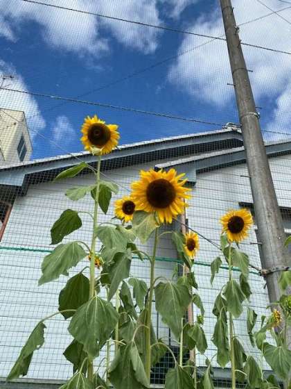 学校では植えられたひまわりが子どもや先生たちよりも高くなり、たくましく咲き誇っています。