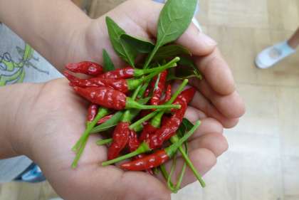 唐辛子を植えておくと近くに植えた作物の虫害が防げるとのことで、これまで茄子やきゅうりを守ってくれていました。「実ってからも料理に使えるので賢い野菜だね。」と感心していました。