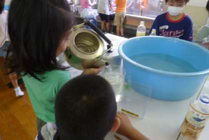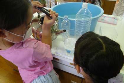 という感覚をつかんだ後は、それぞれの選んだ調理器具にどれくらいの水が入るのか予想を立ててから、実際のかさを確かめます。だんだん予想が当たるようになってきた子どもたち。嬉しそうにいろいろなもののかさを調べていました。