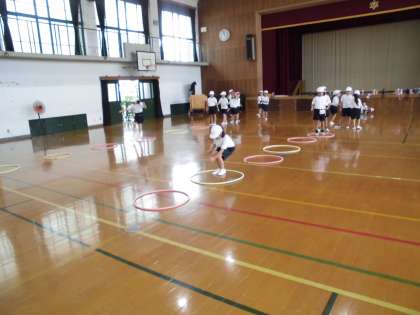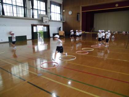 片足で1歩の幅を大きく跳んだり,両足着地で跳んだり,ジャンケンとびを行ったりしました。「だんだん1歩が大きく跳べるようになったよ!」「友達とジャンケンして跳ぶのが楽しい!」と,振り返りを行っていました。膝を曲げて沢山跳べるようになると,いろんな運動や動きに繋がって行きますね。