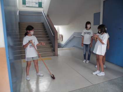 クリーンエコピカ委員会の5年生は,掃除の仕方の「ほうきの使い方」についてのポスターを作るために話し合いをしていました。ポスターに載せるための写真を撮っていたのですが,撮影する角度によって見る人に伝わるかどうかなども考えながら撮影していました。3組の友達も話し合いに参加して活動することができていました。