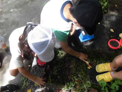学校にいる生き物探しの様子です。朝は雨が降っていましたが,みんなが校庭に出て,生き物探しをしていると晴れてきました!