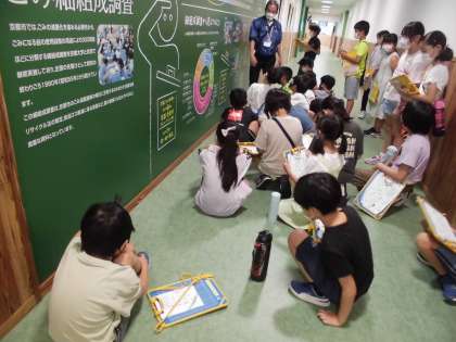実際に見学している様子です。京都の町なみの模型を使い,自力で発電を頑張ったり,ごみを減らす取組について考えたり,展望台で良い景色を眺めたりした写真です。