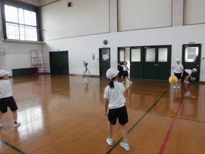 今までドッジビーを使って,投げたり受けたりする練習をしてきました。今日は,ボールを使って受ける投げる練習をしました。ボールを投げたり取ったりすることは,パスゲームの学習にもつながります。その後,赤チームと白チームに分かれて,ドッジボールをしました。ドッジビーとは違うボールを使ってのゲームを,子どもたちはとても楽しんでいました。