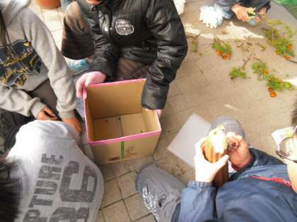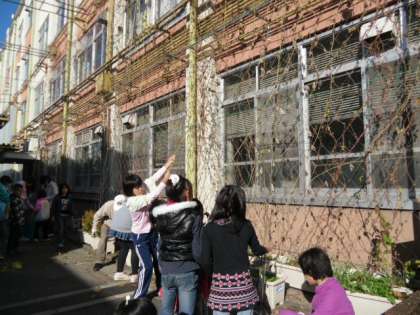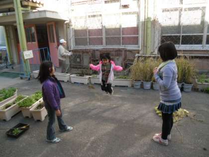 そのうちヘチマの蔓を引っ張り出した子どもたち。引き抜いた蔓で縄とびをしたり,落ちてきたヘチマから種を取ったり。