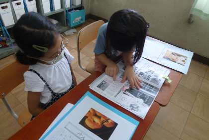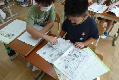 国語科の「どうぶつ園のじゅうい」の学習のゴールは、自分の選んだ仕事のすごいを見つけて紹介する活動です。調べて分かった内容を友達に伝えます。資料の文や写真を指差しながら詳しく説明したり、感想を言い合ったりしました。