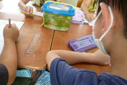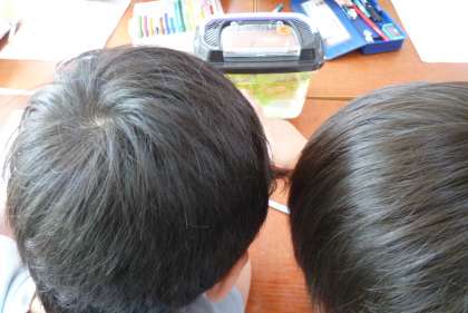 教室でメダカやダンゴムシを育て始めて約2週間がたちました。エサやり、水替えを通して,小さな命への愛着も芽生えています。成長に気づいたり、世話の仕方を工夫したり、グループで相談しながら進めています。