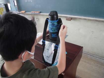 算数科で重さの学習に取り組んでいます。教科書やリコーダーなどの学用品や水筒,給食袋が何グラムか測りました。次はキログラムの学習に取り組む予定です。