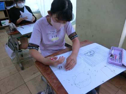 「エヴィーのひみつと消えた動物たち」という本を読んで想像したことを絵に描いています。今日は,下書きをしました!ジャングルや森,動物など,自然のものがたくさん登場する絵になっています。次回からは絵の具も使います。どんな作品が仕上がるか,楽しみです。