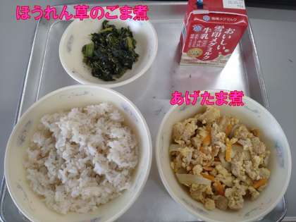 今日の献立は、「麦ごはん・牛乳・あげたま煮・ほうれん草のごま煮」でした。