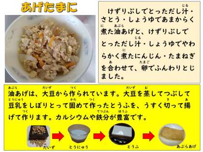 あげたま煮は、けずりぶしでとっただし汁・しょうゆでにんじん・たまねぎをやわらかく煮て、けずりぶしでとっただし汁・さとう・しょうゆであまからく煮含めた油あげを入れて煮、よくといた卵を入れてふんわり仕上がるように火加減を調節しながらしっかり火を通しました。だしの風味やうまみがきいた煮汁を油あぶらや卵がしっとり含んで、ごはんによく合います。子どもたちもごはんと一緒においしそうに食べていました。