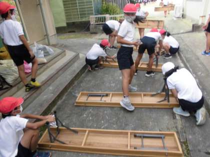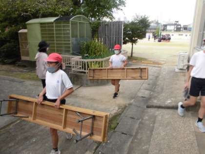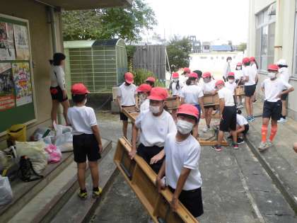 【5年 運動会の裏側】 公開日 2022/10/12 更新日 2022/10/12 5年担任から 運動会で使った長椅子&パイプ椅子&長机を片付けています。 運ぶ人・拭く人・体育館に入れる人と役割をしっかりと分けてできました。 早く(速く)怪我もなくしっかりとできました。すばらしい動きと会話でした。