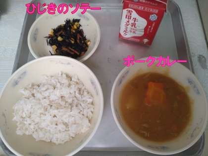 今日の献立は、「麦ごはん・牛乳・ポークカレー・ひじきのソテー」でした。