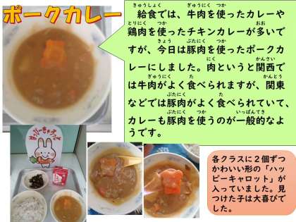 カレーは子どもたちに大人気の献立です。今日は豚肉を使ったポークカレーでした。たまねぎの1/3の量分をきつね色になるまでよくいためて、豚肉を入れてよくいためて、料理酒・ガーリックパウダー・こしょう・塩で味つけしました。にんじん・たまねぎを入れていため、オールスパイスと水・チーズ・じゃがいも・トマトピューレ・ローリエを入れてじっくり煮込みました。小麦粉・バター・脱脂粉乳などで作ったルー・フルーツチャツネ・ヨーグルト・バーベキューソース・ウスタソース・しょうゆ・塩を入れてさらに煮込んで仕上がりです。子どもたちは大喜びで食べていました。「山盛り食べておなかいっぱい。」と嬉しそうに教えてくれた子もいました。
