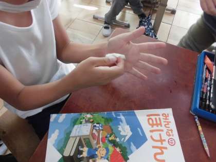 ぬれただっしめんで手をふいて、よごれが付いているかたしかめてみました。しっかり石鹸を使って手を洗っていても、指の間や指先、手のひらに汚れが付いていたので子ども達も驚いていました。もう一度手の洗い方の確認をしました。