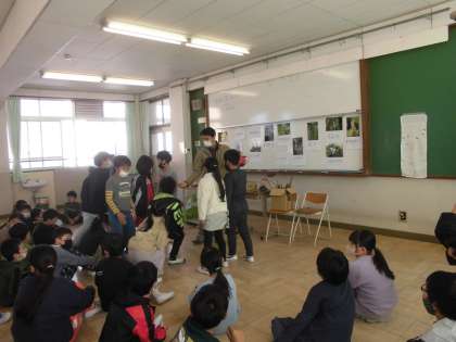 まちくさの中間発表がありました。今回ゲストティーチャーに京都府立植物園の元館長先生に来て頂き、種の不思議についてお話を聞きました。その後、みんなの前でお気に入りのカードを紹介し、まちくさ博士から感想をいただきました。