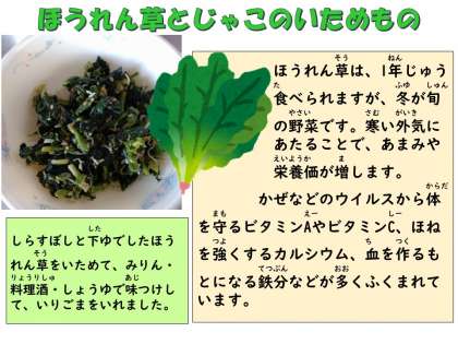ほうれん草とじゃこのいためものは、しらすぼしをいためて、下ゆでしたほうれん草を入れてさらにいため、みりん・料理酒・しょうゆで味つけして、ごまを入れて仕上げました。しらすぼしのうまみや塩分、ごまの風味がきいたこちらもごはんによく合います。ほうれん草は給食でもよく使う食材です。今では1年じゅう食べられますが、冬が旬の野菜です。冬の寒い外気に触れることで甘みが出てきたり、他の季節にくらべて茎が太くなっていたりします。また、栄養価も冬にとれるものがいちばん高くなります。ほうれん草には、風邪を予防するのに役立つビタミンA(βカロテン)やC、骨を作るもとになるカルシウムや血を作るもとになる鉄分など、いろいろな栄養がふくまれています。