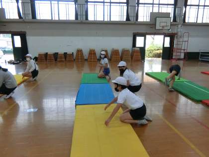 体育科の学習でマット運動の学習を始めました。リズムよく連続技をできるように頑張りました!5年生で,今までできなかった技を習得できるようになりたいと,意気込んでいます!