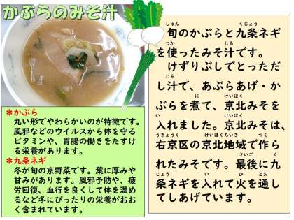 今日のみそ汁は、旬のかぶら、同じく旬の京野菜の九条ネギを使いました。みそは京都市右京区の京北地域で作られた京北みそを使っています。かぶらにも九条ネギにも風邪のウイルスなどから体を守るビタミンが豊富に含まれています。また、九条ネギには体を温める働きのある栄養も含まれています。体を中から温めることも免疫アップにつながり、風邪などを予防する効果があります。だんだん本格的来な寒さとなってきました。温かい汁物や飲物、体を温める効果のある食べ物を食べて体の中からぽかぽかにしたいですね。