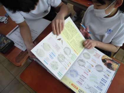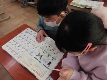 目次をみると,「なかまのことば」が書いてあることを教えてもらいました。それぞれ,「植物の図鑑で,白い花の仲間を見つけて,ワサビは白い花が咲くんだよ。」「深い意生き物図鑑で,クラゲの仲間を見つけて,虹色に光るクラゲを見つけました。」と,目次を使って図鑑をたくさん読んでいました。これまでに学習したことを活かして,たくさん図鑑が読めるようになりましたね。