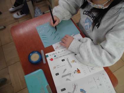 漢字の“「とめ」「はね」「はらい」に気をつけよう。”というめあてで学習を進めました。初めに「ためしがき」を行い、その次に水書用筆で練習を行い、最後に「まとめがき」を行いました。水書用筆を使用することで、まとめがきをする時には字の払い方に気を付けたと話していました。