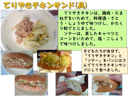 てりやきチキンサンドは、てりやきチキンとソテーを子どもたちが自分でパンにはさんでサンドにして食べます。てりやきチキンは鶏肉とたまねぎをいためて料理酒・さとう・しょうゆで味つけしました。はさみやすいように、かたくり粉でとじています。ソテーは蒸してやわらかく甘みを出したキャベツとコーンをいためて、塩・こしょうで味つけしました。子どもたちは、給食カレンダーの食べ方を見ながら、上手にパンに切れ目を入れてはさんで食べていました。全部はさみきれずに残りおかずとして食べている子や、何とかして全部入れきっていた子、パンを少しずつちぎって小さなサンドを作っていた子などそれぞれ楽しみながら食べていました。朝から楽しみにしてくれていた子もいて、大人気でした。