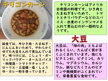チリコンカーンは、牛ひき肉をいためてこしょう・ガーリックパウダー・オールスパイスで味つけして、たまねぎ・にんじんをいれていため、料理酒・水・大豆のゆで汁・やわらかくゆでた大豆・トマトケチャップ・ローリエを入れて煮込みました。三温糖・塩・しょうゆ・カレー粉を入れて、さらにじっくり煮込みました。子どもたちの好きなカレー味で、大豆が苦手な子にも食べやすく、喜んで食べていました。パンともよく合い、パンにつけて食べている子もいました。